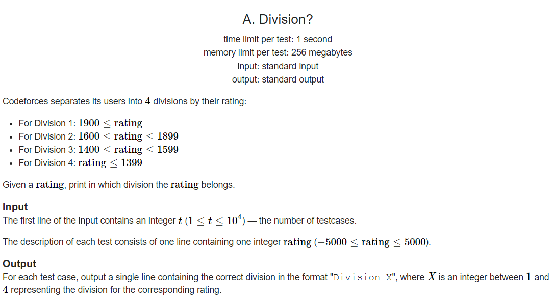 간단하게 rating점수를 구간에 따라서 Division 1부터 Division 4까지 출력하는 문제이다.