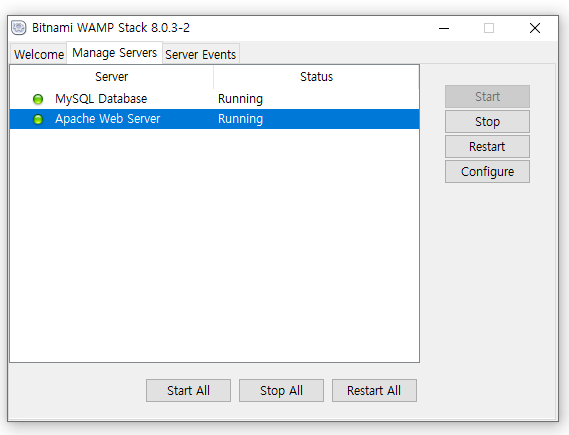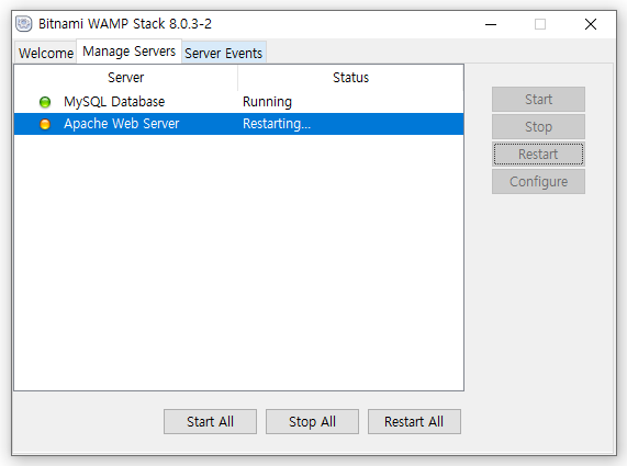 3. 윈도우 키를 눌러 Bitnami WAMP Stack Manager Tool 앱을 실행시켜주고 상단 바에서 Manage Servers를 눌러 Apache Web Server를 선택해 Restart 해준다.