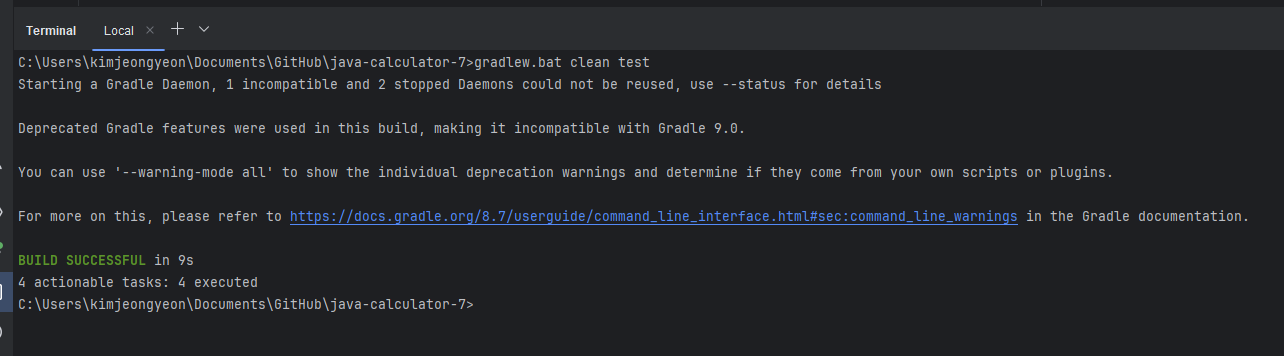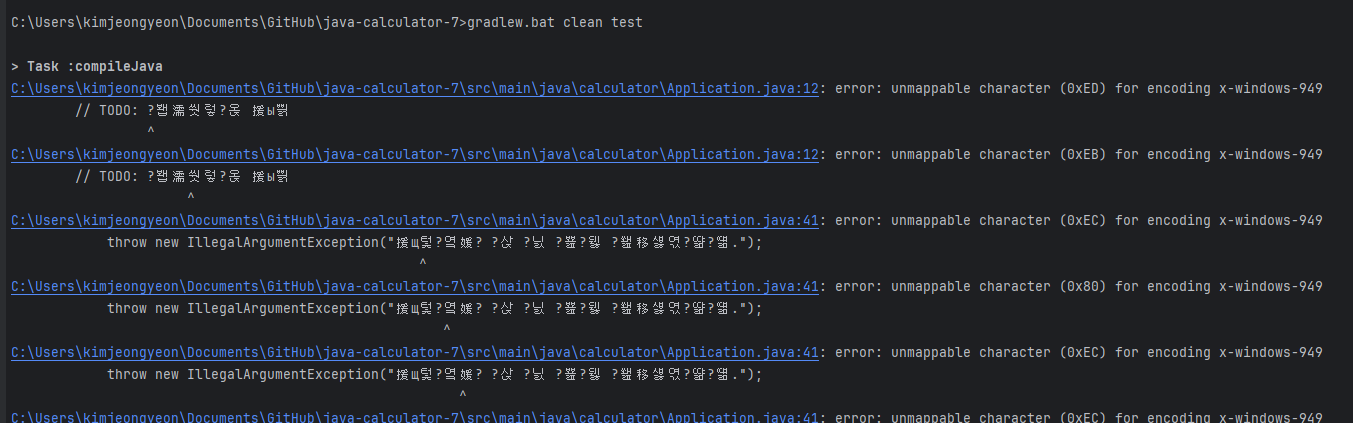 IDE에서 콘솔창을 하나 열고 gradlew.bat clean test 를 실행해봤지만 아래처럼 한글이 깨지게 나왔다.