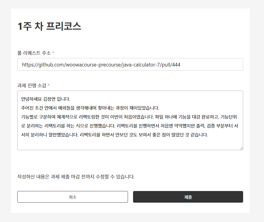 pull request를 생성하고, 과제를 제출하였다. pull request 내용으로는 뭘 넣을 지 몰라 README에 있는 내용을 그대로 넣었다.