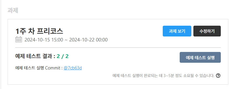 과제를 제출하고 예제 테스트 진행 결과 다행히 테스트 실패 없이 성공하였다.