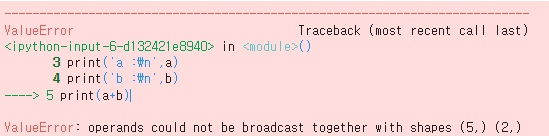 - 반면에 위 코드처럼 넘파이의 브로드캐스팅 기능이 덧셈이 불가능하다고 판단하면 오류가 발생한다.