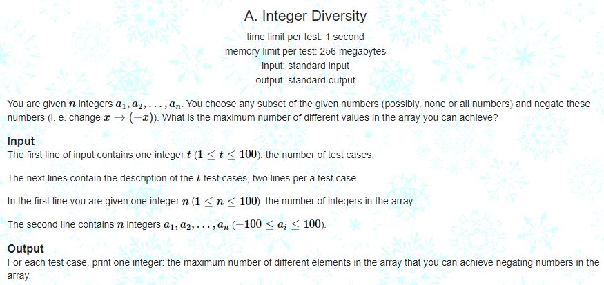 예를 들어, [1 2 1 2 2]인 정수 배열은 각기다른 숫자의 값이 2개이다. 1 2가 2개이상 중복되므로 하나씩 음수로 변환시키면 [1 -1 2 -2 2]로 볼 수 있다. 이 배열은 각기다른 숫자의 값이 4개이다.(원소의 수는 5개이지만 2가 2개이므로 겹친다)