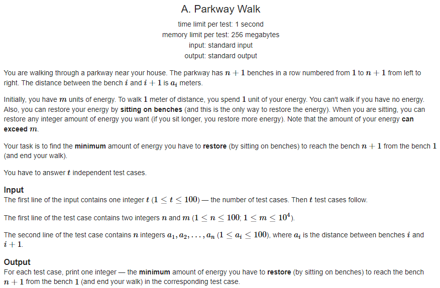처음에 테이스 케이스가 주어진다. 테스트 케이스의 첫번째 줄은 벤치 사이의 거리가 몇개나 있는지(n+1 = 벤치 수), 출발 시 가지고 있는 에너지량(m)을 입력받는다. 테스트 케이스의 두번째 줄은 벤치 사이의 거리를 입력받는다.