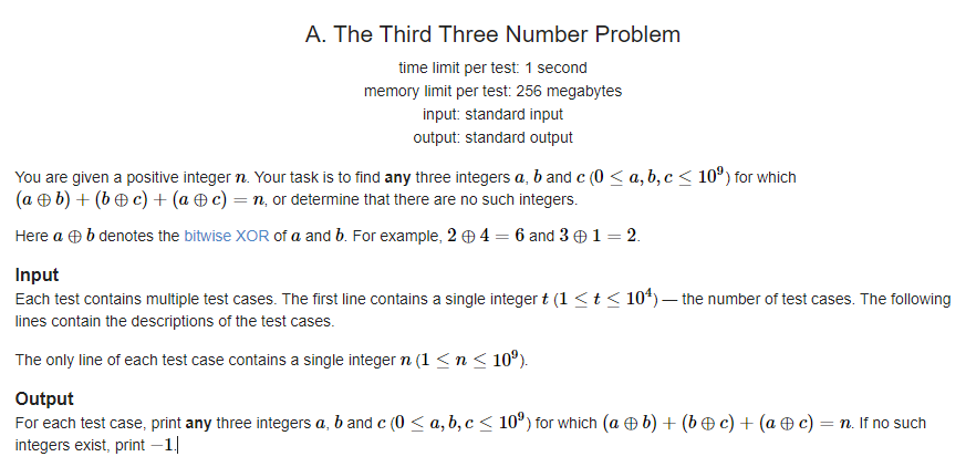 정수 n이 짝수일 경우 a, b, c는 a^b = 0, b^c = n/2, c^a = n/2를 만족하는 a, b, c를 구하면 된다.