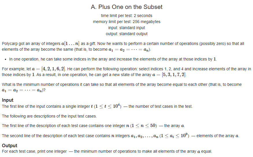 정수배열이 주어진다. 정수 배열 안에있는 정수들에게 1을 더하는 '행동'을 할 수 있다. 정수배열에 있는 수가 모두 같아지기위한 최소 '행동' 수를 구하여라.